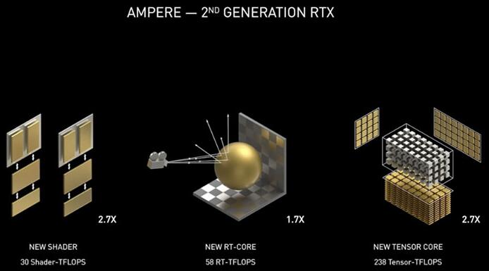 最后但并非最不重要的一点是,Huang完成了GeForce RTX 3090的包装。是的,它是Titan的替代品,因此不是这一代的“旗舰”卡。但是,有些人可能会选择它,因为它被吹捧为游戏和创作的理想之选。在游戏方面,RTX 3090被认为是首款能够以60fps的速度在8K下玩游戏的消费类图形卡。与之前的产品相比,它在4K时的速度提高了50%,并且其新的散热器使它的噪音降低了10倍,GPU的温度也降低了30摄氏度。