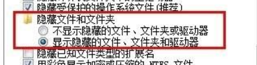 2,打开我们可以看到关于是否显示隐藏文件和文件夹的选项(如下图):