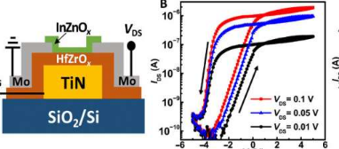 Kim等。首先通过开发具有氮化钛/掺杂锆的氧化oxide /氮化钛(TiN / HfZrOx / TiN)结构的电容器来确定掺锆的氧化oxide的铁电性能,并测量24 nm的极化电场特性厚的材料。材料的矫顽电场大于铁电钙钛矿氧化物的矫顽电场,并且在铁电晶体管中是有利的,因为较大的矫顽电场会导致更大的存储窗口。接下来,研究小组使用压电响应力显微镜确认了掺锆的氧化ha的铁电性。以及电容电压测量,以确认其铁电特性以实现持久特性。科学家们测试了采用底部接触结构的铁电薄膜晶体管(FeTFT)进行集成策略的可行性,该结构使用原子层沉积基锆掺杂的氧化oxide和铟锌氧化物(HfZrO x和InZnO x)开发。为了确认这些铁电薄膜晶体管的可靠性, Kim等人。还测试了它们的耐力性能。该装置的坚固耐用性源于其无界面层的金属-铁电半导体结构。与以前的存储设备(例如电荷陷阱存储器)相比对于基于钙钛矿氧化物的铁电晶体管,使用HfZrO x和InZnO x可以降低功能电压,加快运行速度并降低处理温度。