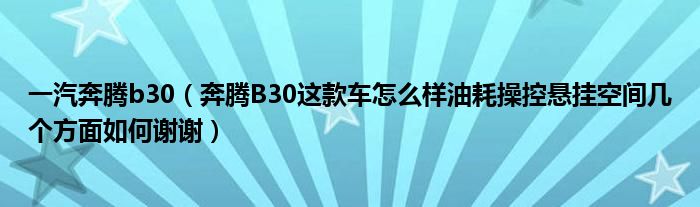 1,奔腾B30这款车怎么样油耗操控悬挂空间几个方面如何谢谢:奔腾B30口碑-优点|缺点|油耗-车型口碑4.8分高于同级16.25%优 点:稳重大气61时尚动感50座椅舒适27空间够用22空间充裕19缺 点:舒适性差33内饰材质差28噪音问题22方向盘问题20减震问题9
