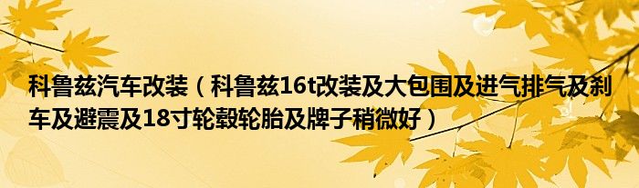 1,科鲁兹16t改装 大包围 进气排气 刹车 避震 18寸轮毂轮胎 牌子稍微好:至少4万。改轮圈还要贵一些。车原本有涡轮但改了气门那么涡轮就要做调整了。刹车盘要增大至少5000元(稍微好一点)车轮胎要米其林的。逼震器是最贵的了。要么你把前面改装成A臂式的。后面横向独立悬挂。