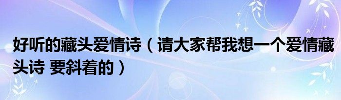 大家好,小联来为大家解答以上的问题。好听的藏头爱情诗,请大家帮我想一个爱情藏头诗 要斜着的这个很多人还不知道,现在让我们一起来看看吧!