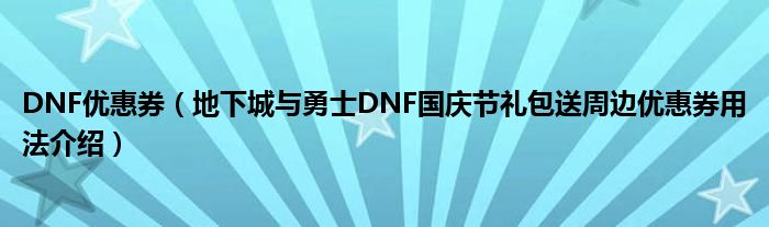 大家好,今天小悦来为大家解答以上问题。DNF优惠券,地下城与勇士DNF国庆节礼包送周边优惠券用法介绍很多人还不知道,现在让我们一起来看看吧!