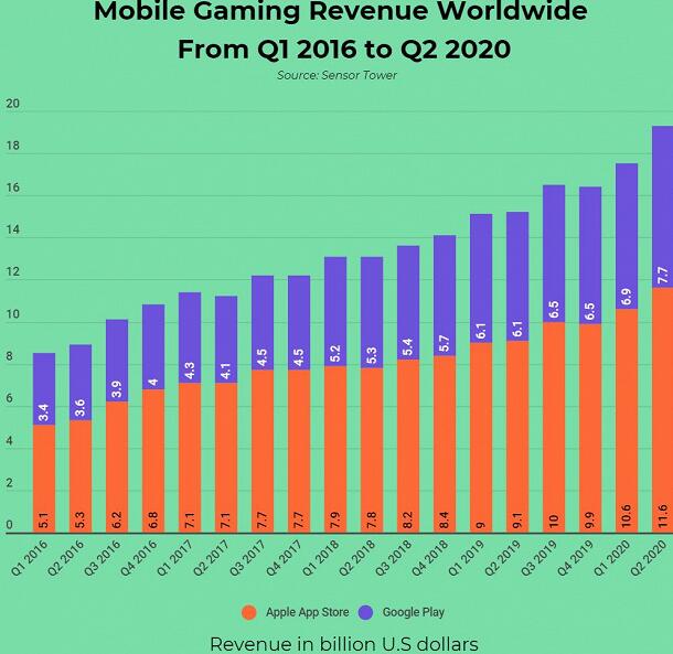 就收入而言,根据Statista的数据,第一季度App Store游戏收入为106亿美元,高于Play商店的69亿美元。在第二季度,这些数字分别等于11.6亿美元和77亿美元。将这些数字加在一起,App Store的游戏应用程序在上半年产生了222亿美元的收入。以每年计算,这几乎增加了23%。Play商店应用带来了146亿美元的收入。